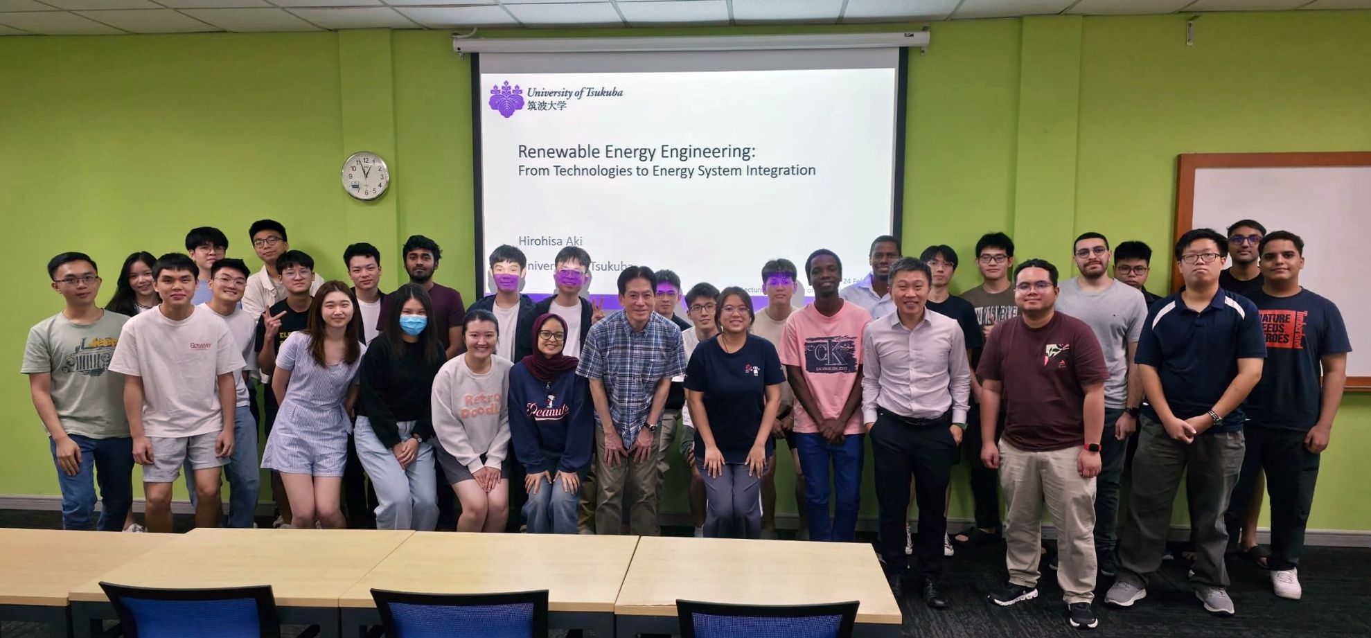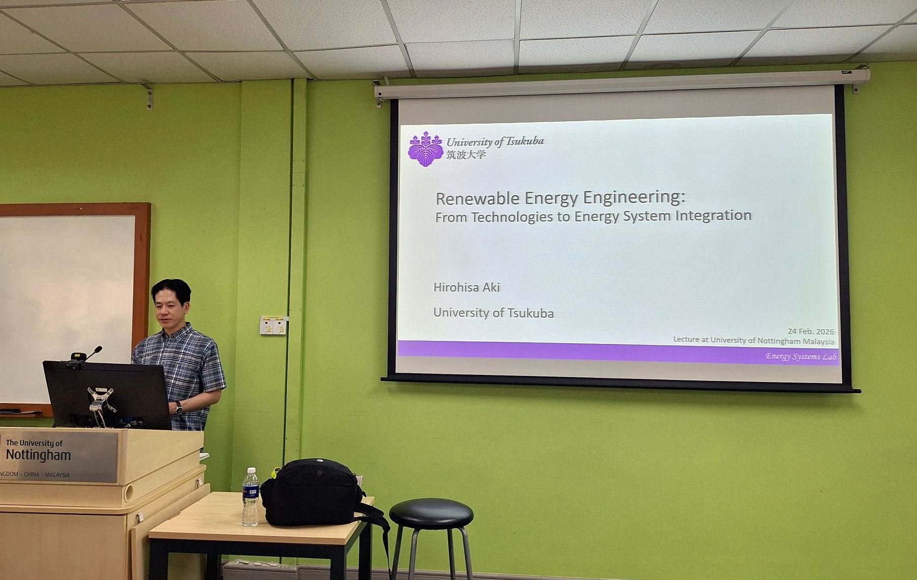 2026年2月24日(火)と25日(水)にノッティンガム大学マレーシア校を訪問し、特別講義と研究事業の打合せを行いました。エネルギーシステム研究室の安芸は、数理物質系磯部高範准教授とともに、JST NEXUS事業に採択され、2026~2028年の期間において、University of Nottingham Malaysia(UNM)のFreddy Tan Kheng Suan准教授、Haider Almurib教授らと国際共同研究を行います。研究課題は「Empowering Indigenous Communities through Sustainable Electrification: Hybrid PV-Battery Systems for Rural Malaysia(持続可能な電化による先住民コミュニティのエンパワーメント:マレーシア農村部向け太陽光発電・蓄電池ハイブリッドシステム」です。研究開発のみならず学生交流にも積極的に取り組み、ささやかながら両国の相互理解と関係強化に貢献して参ります。将来を担う両国の学生が、国境を越えた共同事業を経験することで、国際協力が双方により大きな成果をもたらすことを学んでもらいたいと思います。